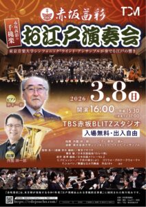 東京音楽大学シンフォニックウインドアンサンブルが奏でる江戸の響き、学長・野平一郎氏のピアノ演奏。赤坂茜彩の千穐楽。(参加費無料)